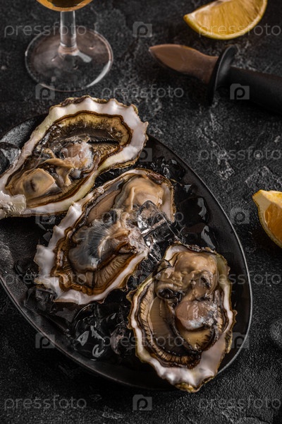 Свежие устрицы крупным планом на льду, подаются с лимоном и вином
