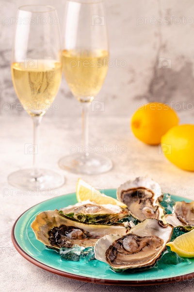 Открытые свежие устрицы на синей тарелке, подаются с лимоном и льдом