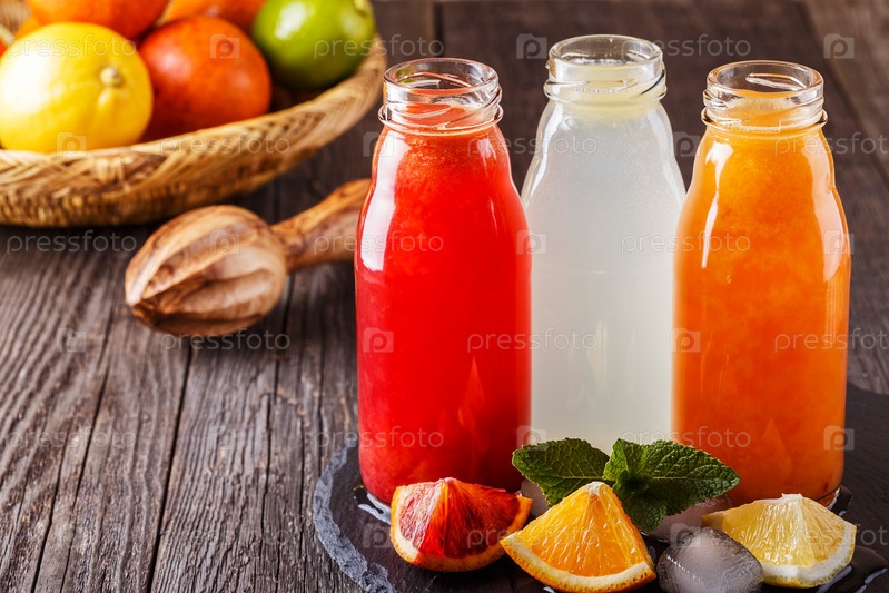 Свежие цитрусовые соки на темном деревянном фоне