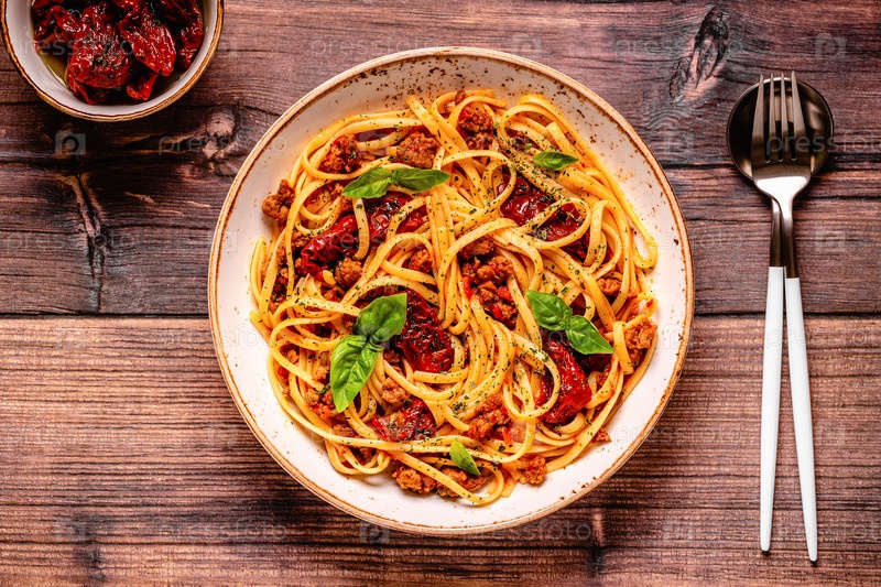 Паста с соусом болоньезе и вялеными томатами
