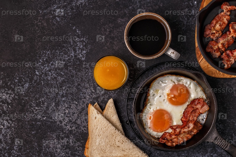 Завтрак с беконом, яичницей, кофе и апельсиновым соком