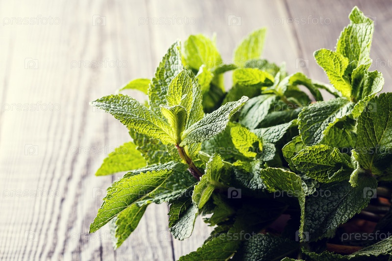 Зеленая свежая мята на деревянном столе