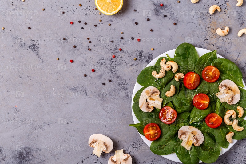 Салат со шпинатом, грибами и помидорами на бетонном фоне