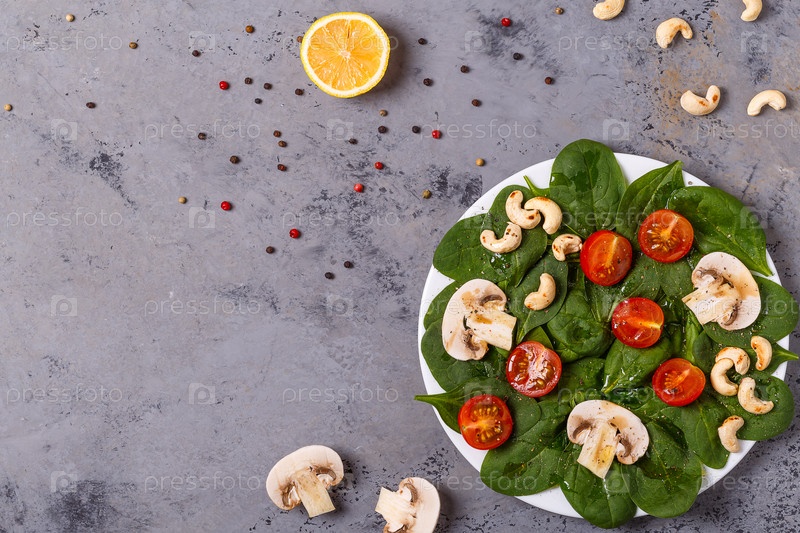 Салат со шпинатом, грибами и помидорами на бетонном фоне