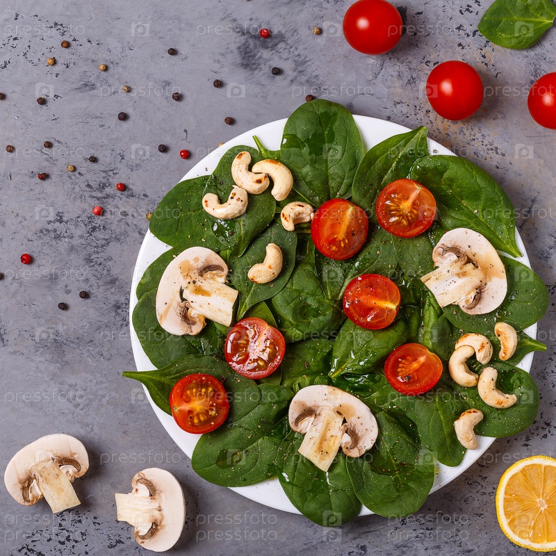 Салат со шпинатом, грибами и помидорами на бетонном фоне