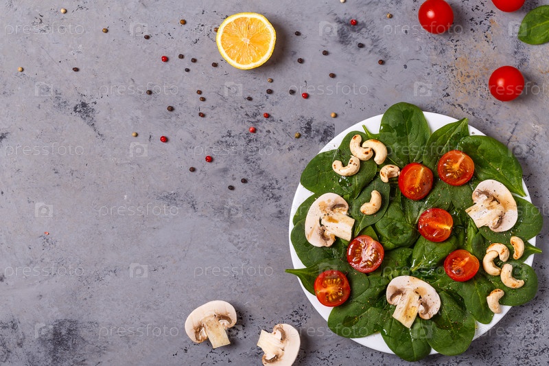 Салат со шпинатом, грибами и помидорами на бетонном фоне