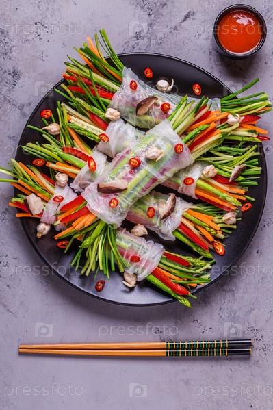 Спринг-роллы с овощами и грибами шиитаке на тарелке