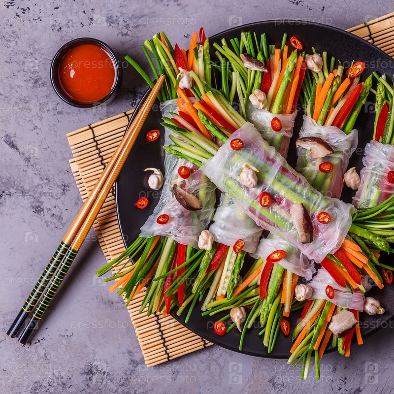 Спринг-роллы с овощами и грибами шиитаке на тарелке