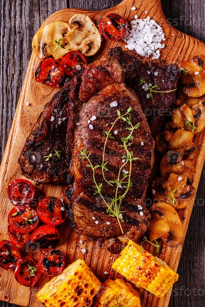 Стейки из говядины с жареными помидорами, грибами и кукурузой