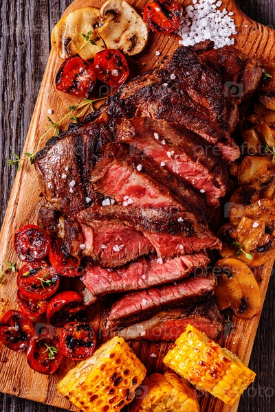 Стейки из говядины с жареными помидорами, грибами и кукурузой