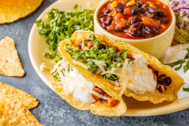 Тако с чили кон карне, салатом, сыром и сметаной