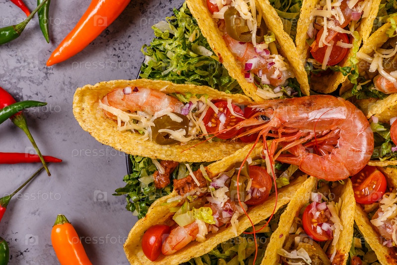 Тако с креветками, листьями салата, сыром и халапеньо