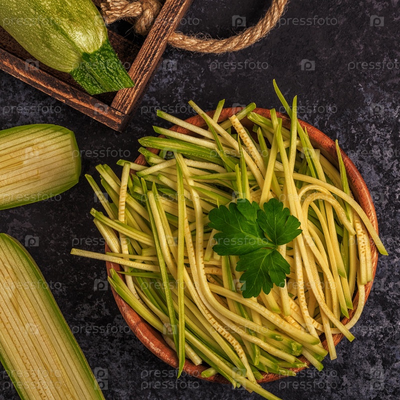 Сырые макароны из цуккини на темном фоне