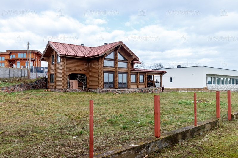 Деревянный бревенчатый дом на берегу большого озера. Объекты незавершенного строительства