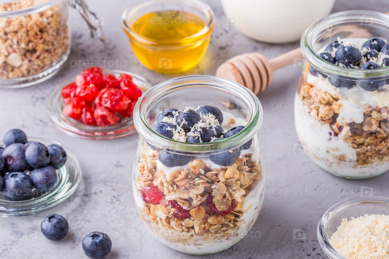 Здоровый завтрак - стеклянные банки овсяных хлопьев со свежими фруктами, йогуртом и медом