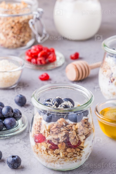 Здоровый завтрак - стеклянные банки овсяных хлопьев со свежими фруктами, йогуртом и медом