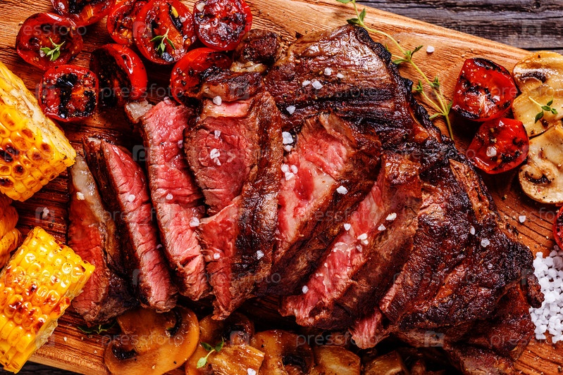 Стейки из говядины с жареными помидорами, грибами и кукурузой