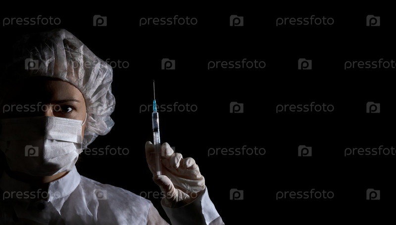 Женщина-врач (или медсестра) в защитной маске и медицинской шапочке держит шприц с лекарством или вакциной в руке в перчатке на черном фоне. Половина лица в тени, драматические эмоции. Концепция защиты от вирусов, профилактика эпидемий, лечение заболевани