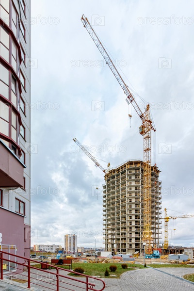 Кран и строящееся здание против голубого неба