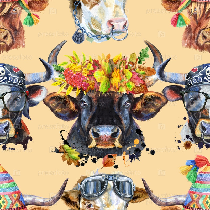 Акварельная графика быка. Бесшовный узор. Иллюстрация животного быка с всплеском акварельного текстурированного фона