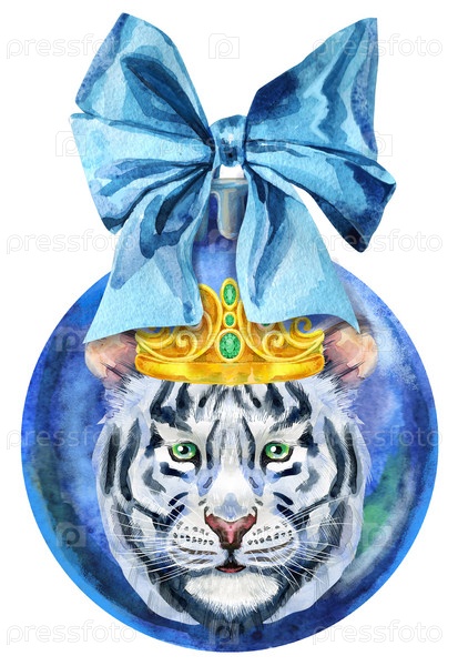 Акварель синий Рождественский бал с луком и тигром, изолированные на белом фоне
