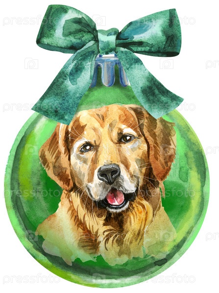 Акварель Рождественский зеленый шар с бантом и собакой, изолированные на белом фоне
