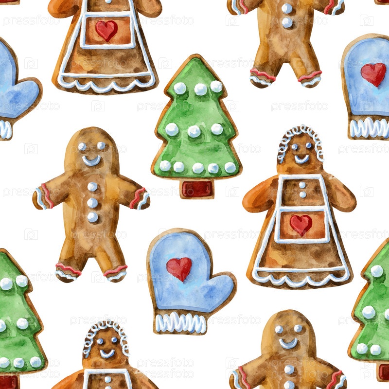 Бесшовный узор. Акварельные рождественские пряники. Ручная роспись пряничного человечка на белом фоне. Для дизайна, фона или печати