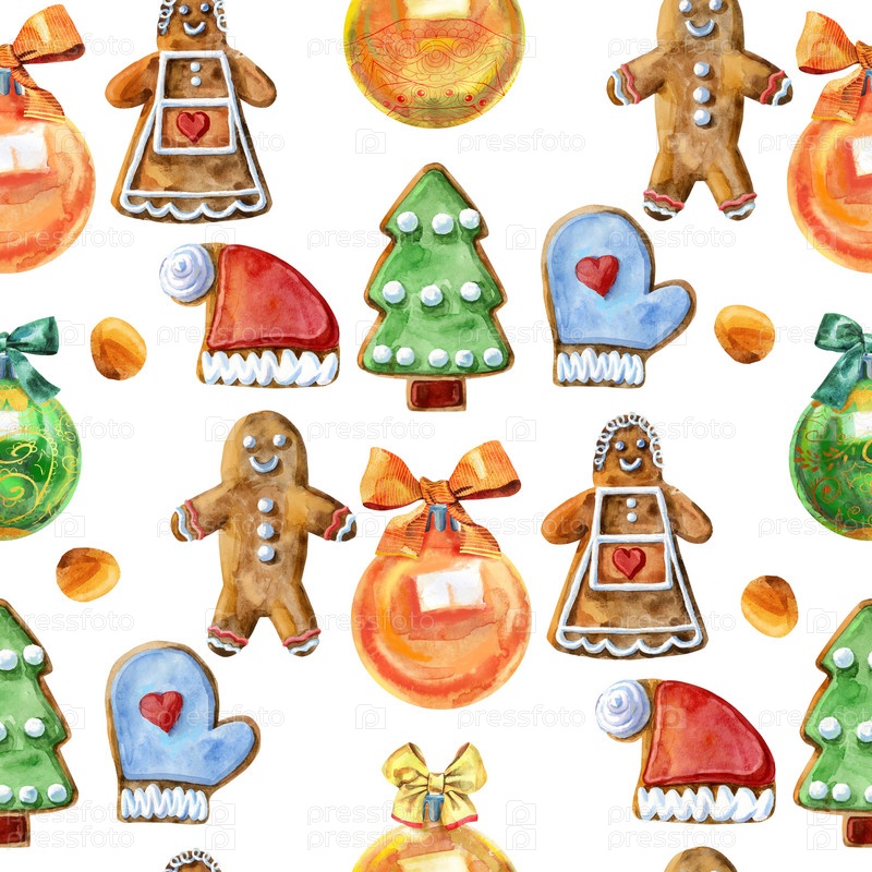 Бесшовный узор. Акварельные рождественские пряники. Ручная роспись пряничного человечка на белом фоне. Для дизайна, фона или печати