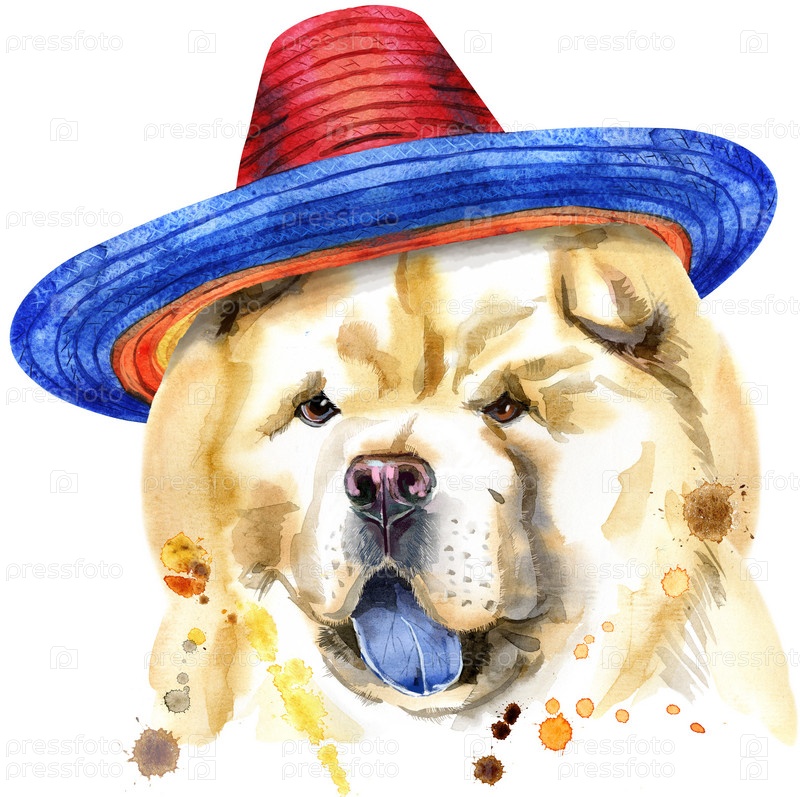 Симпатичная собака в мексиканской шляпе. Графика на футболках с собаками. акварель чау-чау собака иллюстрация