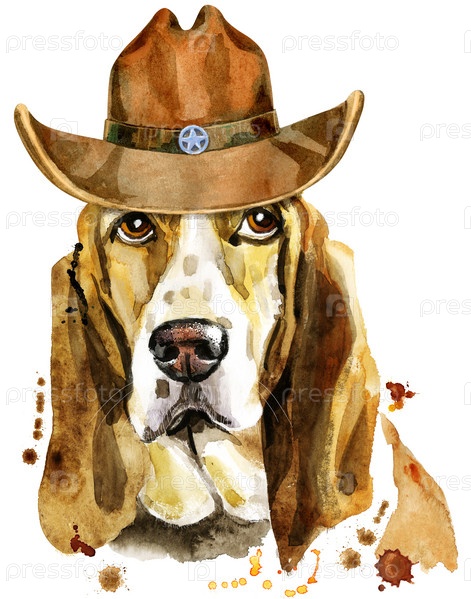 Симпатичная собака в ковбойской шляпе. Графика на футболках с собаками. акварель бассет-хаунд