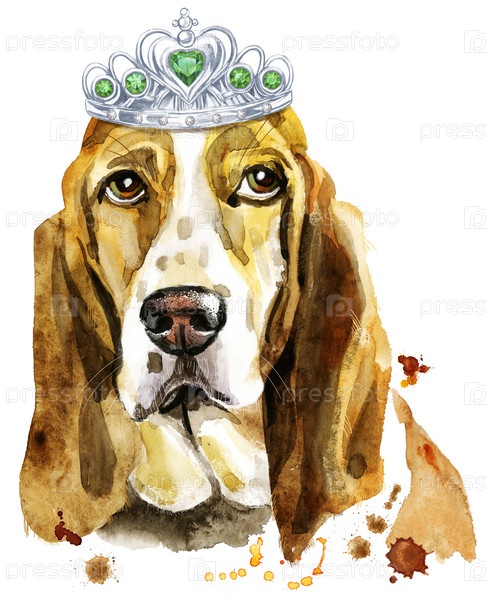 Милая собака. Графика на футболках с собаками. Акварельный бассет-хаунд с серебряной короной