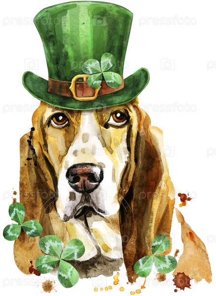 Акварельный портрет бассет-хаунда в шляпе лепрекона с листьями клевера