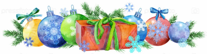 Акварельная граница елки из шаров со снежинками и подарком. Карта для вашего творчества