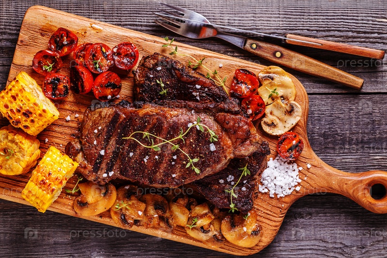 Стейки из говядины с жареными помидорами, грибами и кукурузой