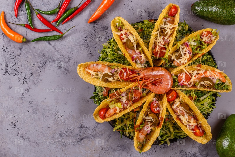 Тако с креветками, листьями салата, сыром и халапеньо