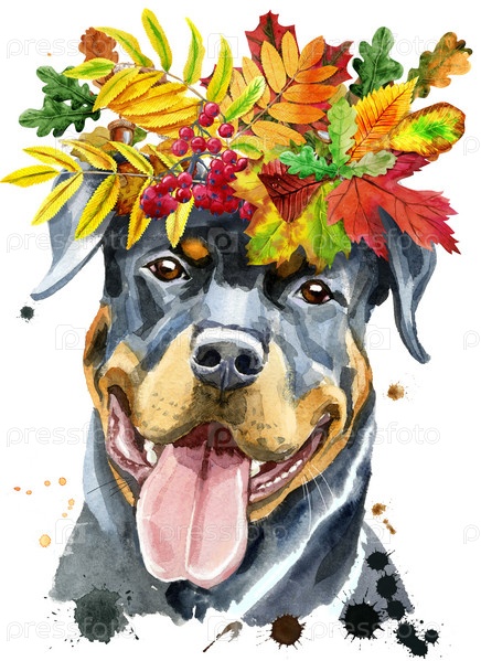 Милая собака. Графика на футболках с собаками. акварельный ротвейлер с венком из осенних листьев