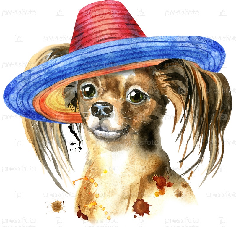 Симпатичная собака в сомбреро. Графика на футболках с собаками. акварель тойл терьер иллюстрация