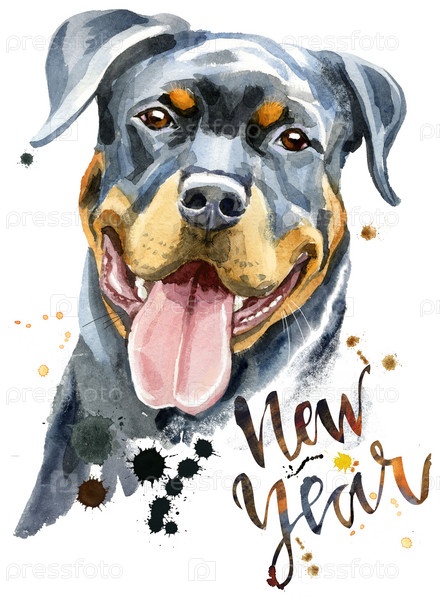 Милая собака. Графика на футболках с собаками. акварель ротвейлер с надписью Новый год
