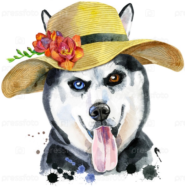 Акварельный портрет хаски в летней шляпе с фрезией