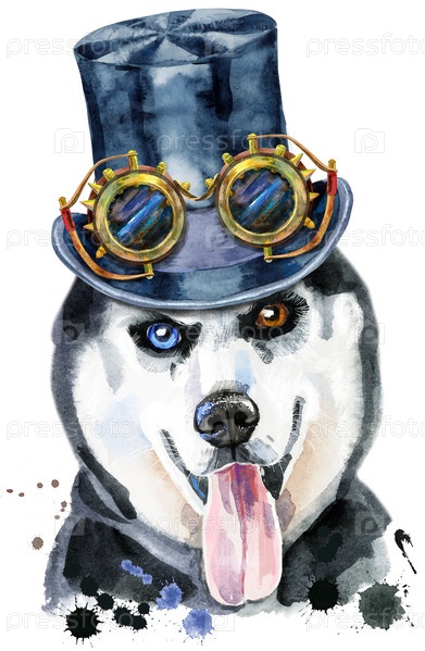 Акварельный портрет хаски в черной шляпе и очках в стиле стимпанк