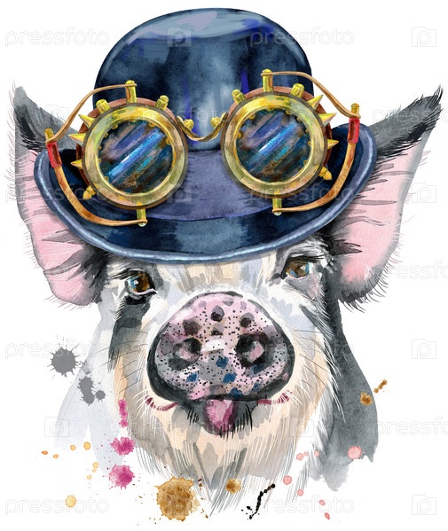 Милый поросенок в шляпе-котелке и очках в стиле стимпанк. Свинья для графики на футболках. Акварельная свинья в черных пятнах