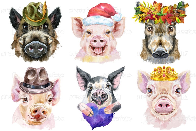 Акварельная иллюстрация свиней в венке из осенних листьев, шляп, шляп Санты, золотой короны, с фиолетовым сердцем