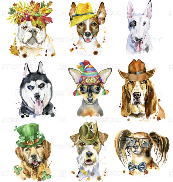 Набор акварельных портретов собак для украшения
