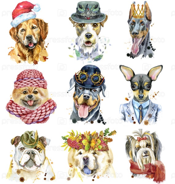 Набор акварельных портретов собак для украшения