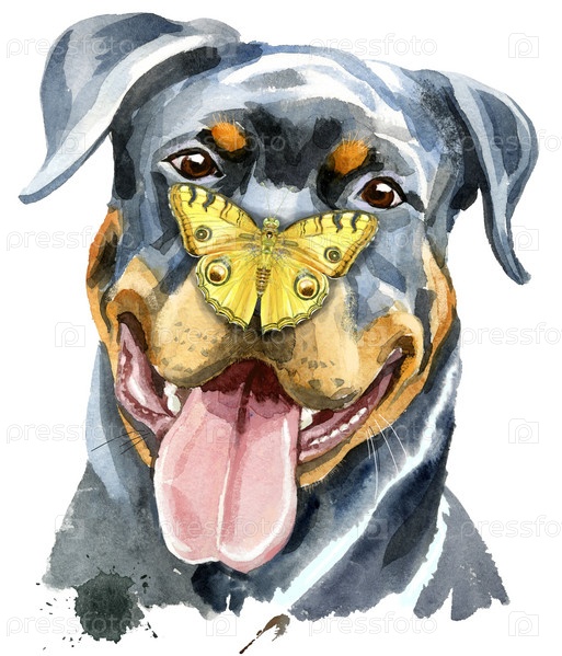 Акварельный портрет ротвейлера с бабочкой на носу