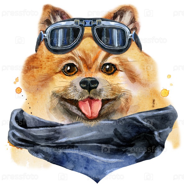 Симпатичная собака в байкерских солнцезащитных очках. Графика на футболках с собаками. акварель померанский шпиц иллюстрация