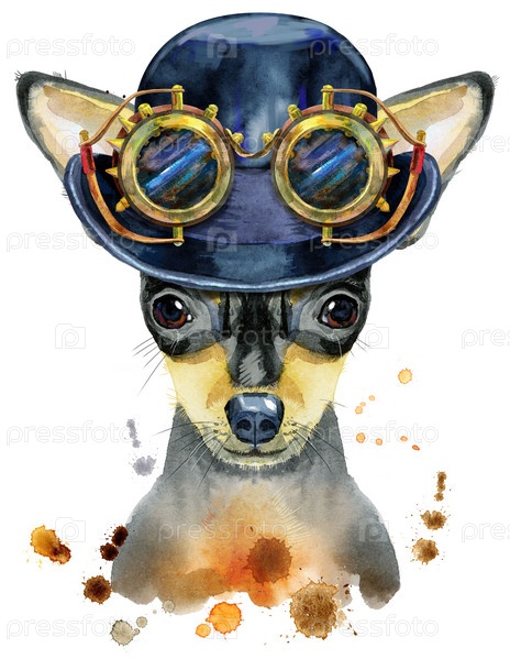 Акварельный портрет игрушечного терьера в шляпе-котелке и стимпанк-очках