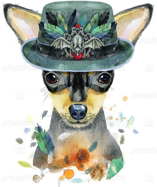 Акварельный портрет игрушечного терьера в оливковой шляпе с вороньим черепом и перьями
