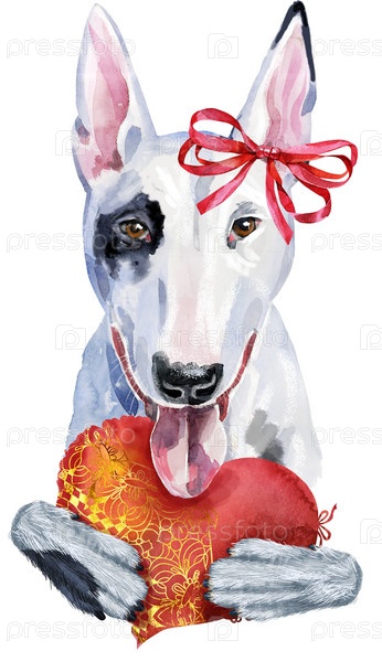 Симпатичная собака с красным сердцем и бантом. Графика на футболках с собаками. акварельный бультерьер
