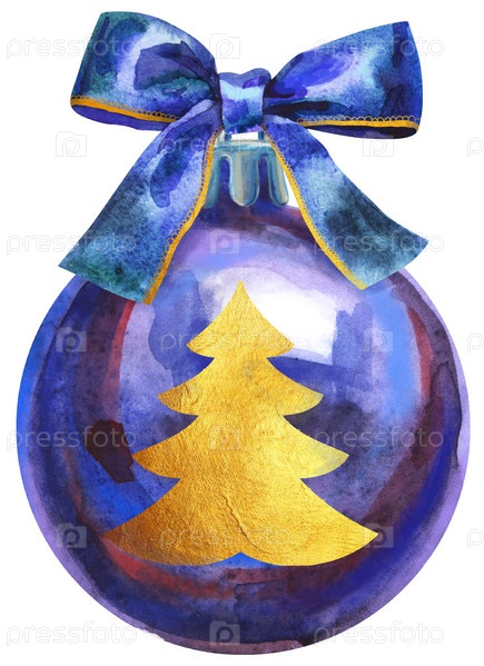 Акварель Рождественский фиолетовый шар с бантом на белом фоне